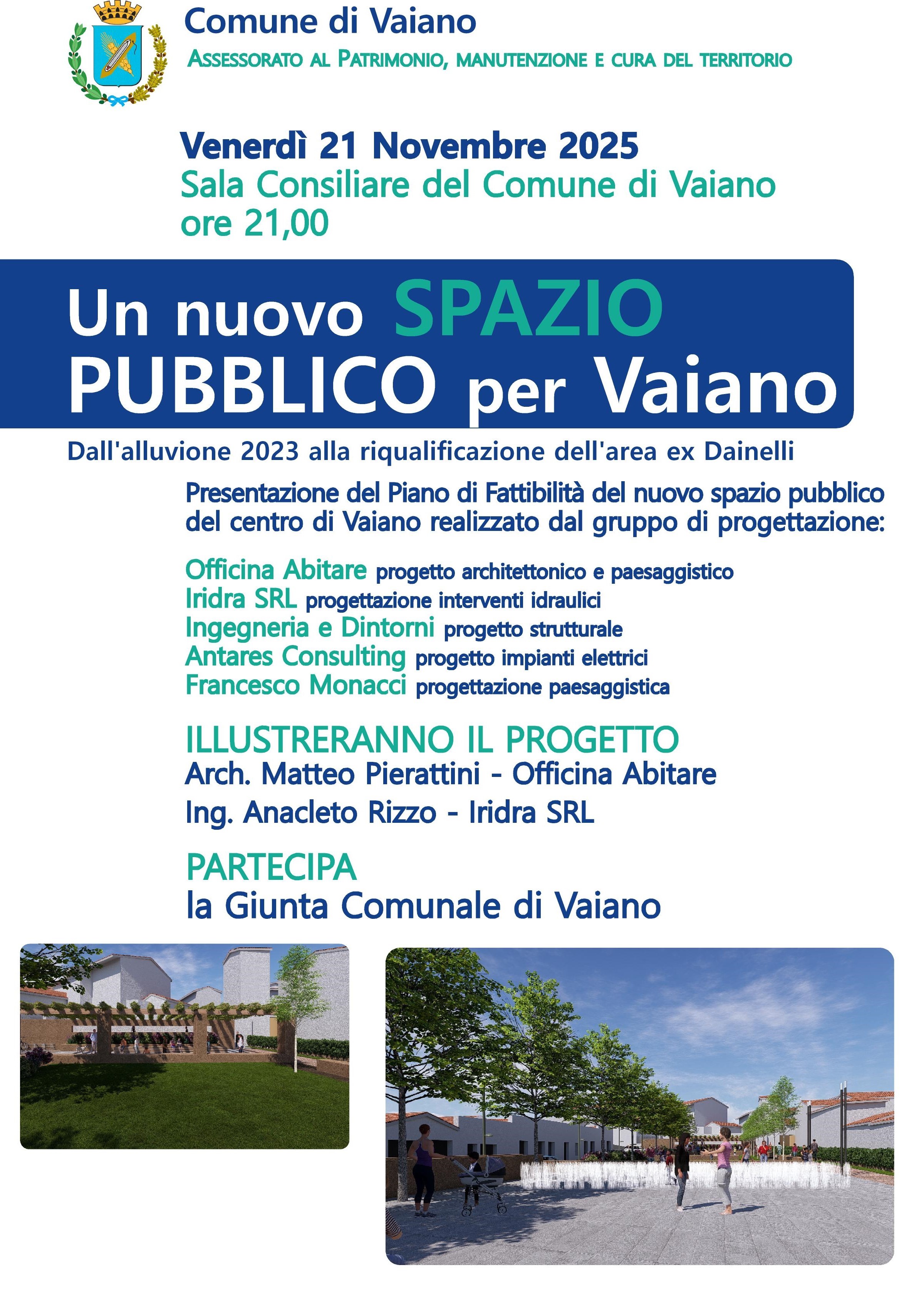 Vaiano, 18 novembre 2025 – L’Amministrazione comunale di Vaiano invita la cittadinanza a partecipare all’assemblea pubblica di venerdì 21 novembre, alle ore 21, nella Sala consiliare del Comune, dedicata alla presentazione del Piano di Fattibilità tecnico-economica del nuovo spazio pubblico che sorgerà nell’area ex Dainelli, nel cuore del paese.