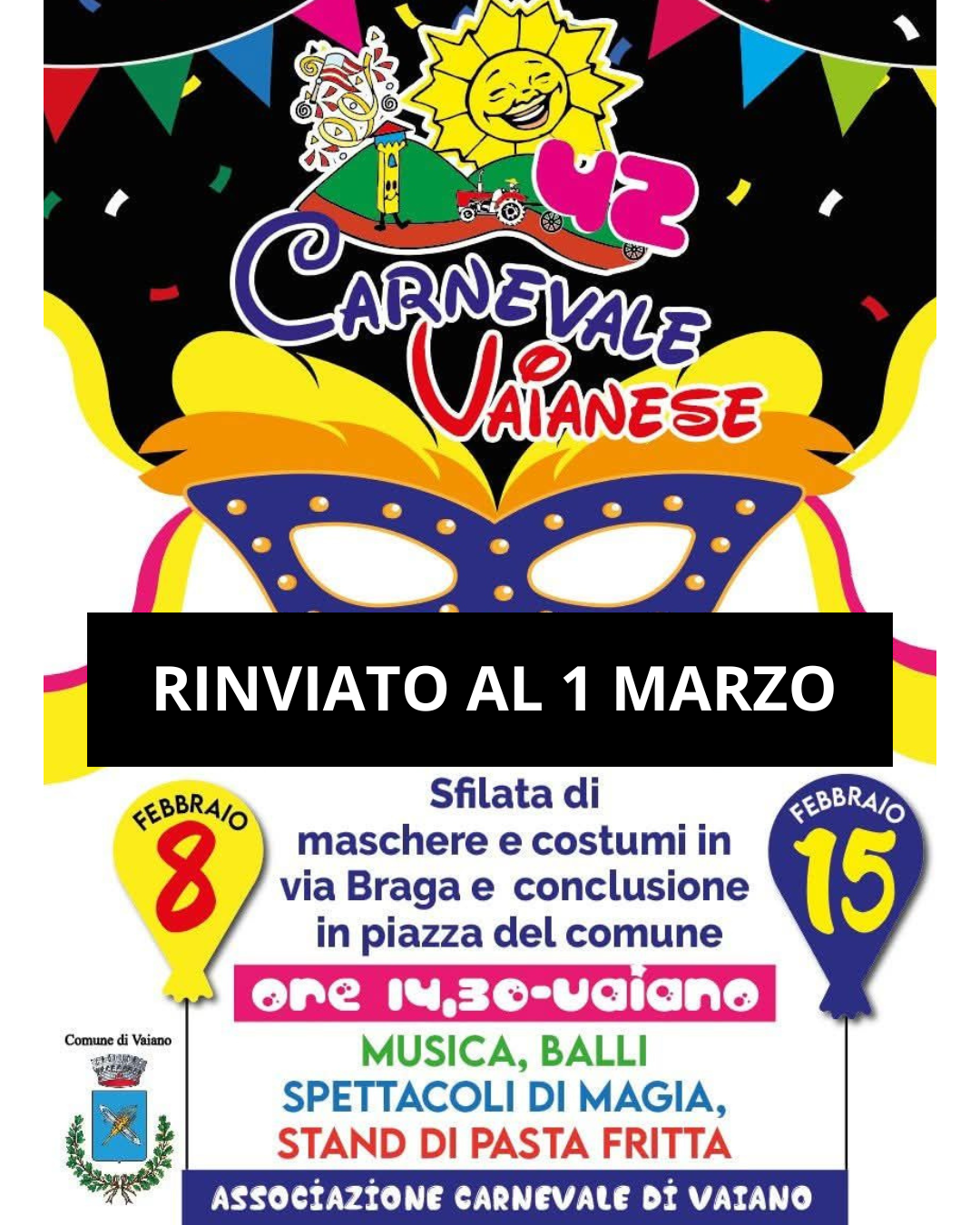 Vaiano, 12 febbraio 2026 - In segno di rispetto per il lutto che ha colpito l’intera comunità, l’amministrazione comunale e l’associazione del carnevale vaianese, di comune accordo, hanno ritenuto opportuno rinviare la sfilata del Carnevale prevista per il 15 febbraio a domenica 1 marzo.