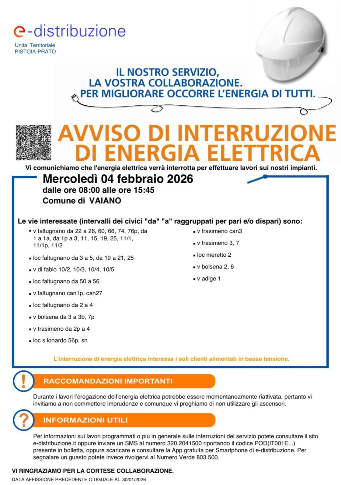 Vaiano, 27 febbraio 2026 – E-distribuzione comunica che mercoledì 4 febbraio e giovedì 5 febbraio è prevista un’interruzione programmata dell’energia elettrica nel territorio comunale di Vaiano, necessaria per consentire lavori di manutenzione sugli impianti.