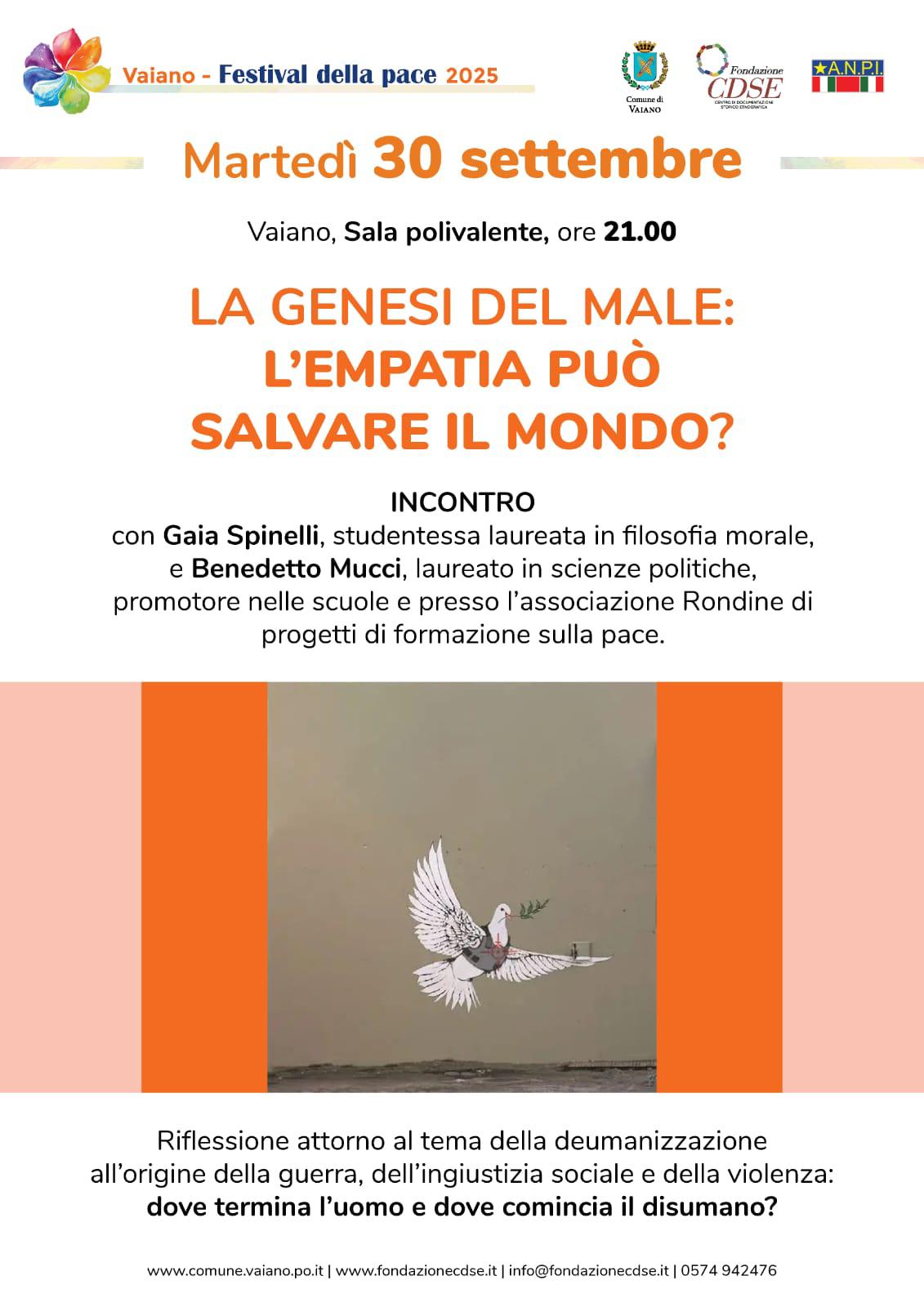 Martedì 30 settembre, alle ore 21, nella Sala polivalente in via Aldo Moro 4 a Vaiano, si terrà l’incontro dal titolo: “La genesi del male: l’empatia può salvare il mondo?”