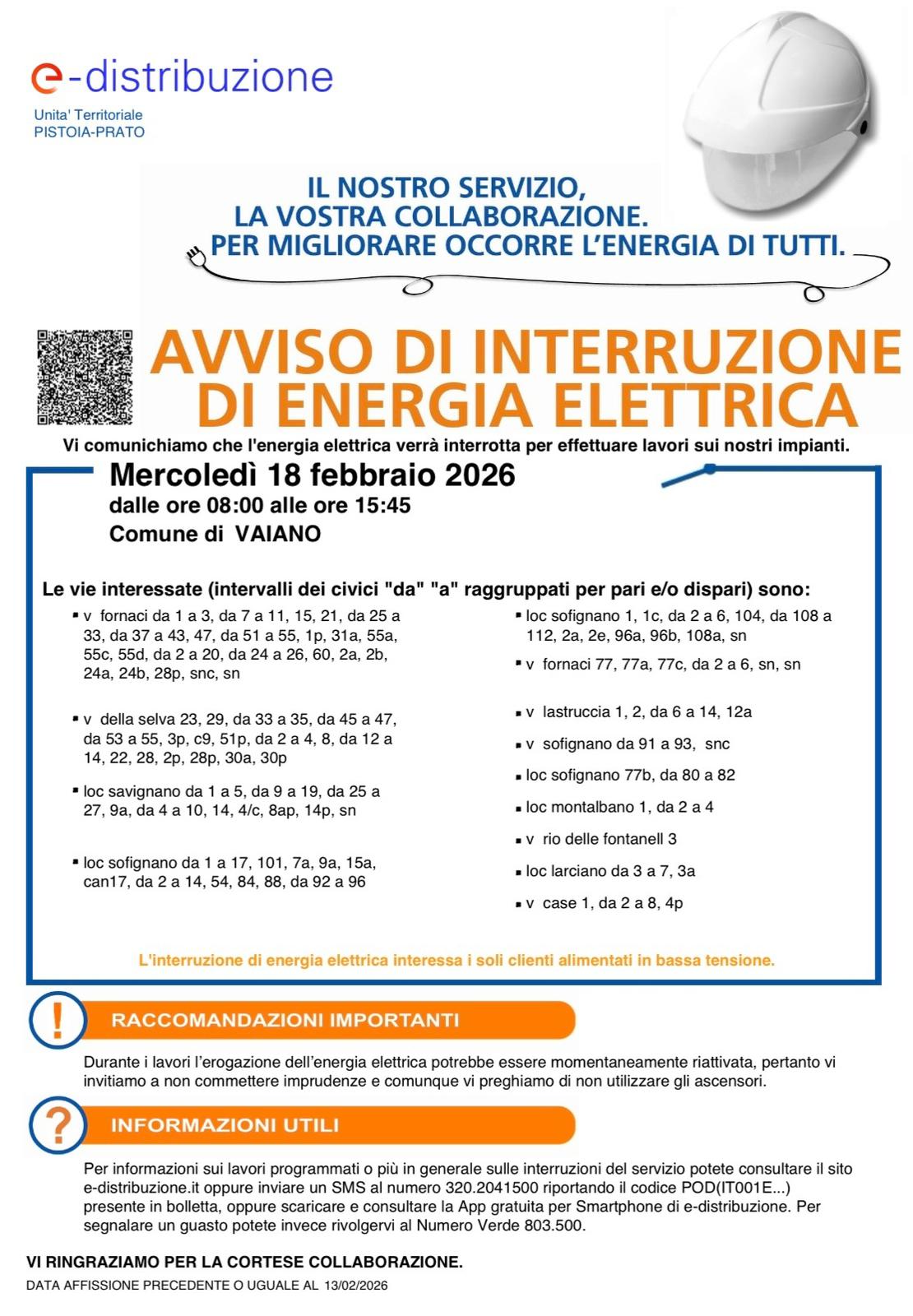 Vaiano, 16 febbraio 2026 - E-Distribuzione informa che mercoledì 18 febbraio 2026, dalle ore 8 alle ore 15.45, è prevista un’interruzione programmata dell’energia elettrica per lavori sugli impianti .
