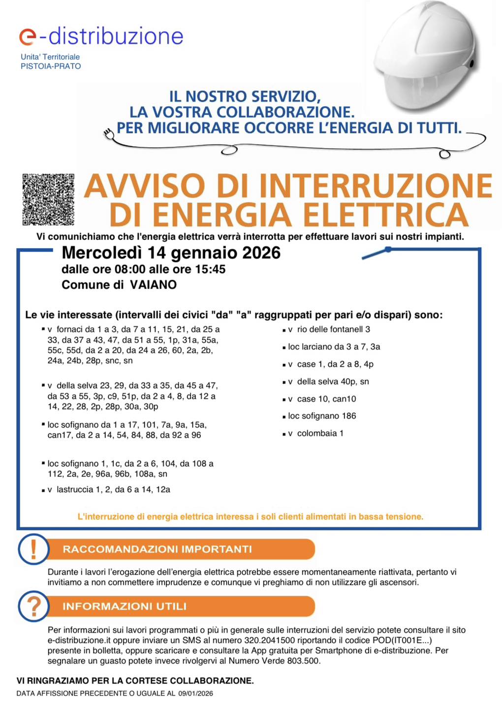 Vaiano, 12 gennaio 2026 - Si informa la cittadinanza che e-distribuzione ha programmato due interruzioni dell’energia elettrica nel Comune di Vaiano per lavori di manutenzione sugli impianti.