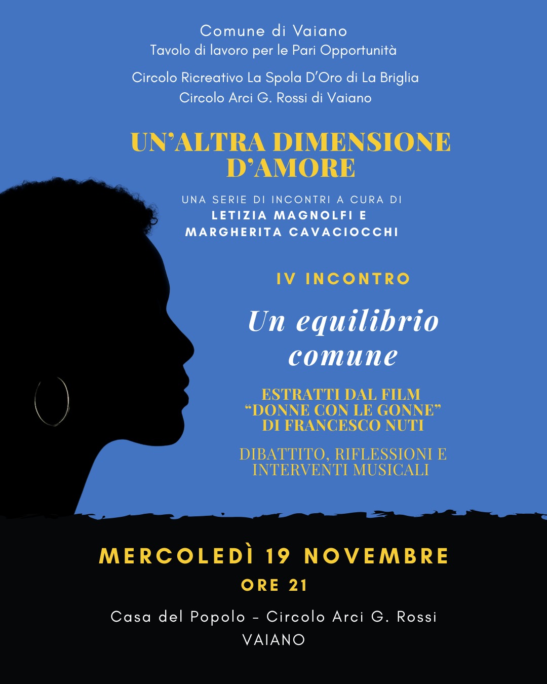 Vaiano, 17 novembre 2025 – Prosegue la rassegna “Un’altra dimensione d’amore”, ideata da Letizia Magnolfi e Margherita Cavaciocchi e promossa dal Comune di Vaiano e dal Tavolo delle Pari Opportunità, in collaborazione con i circoli Arci La Spola d’Oro di La Briglia e Arci G. Rossi di Vaiano.