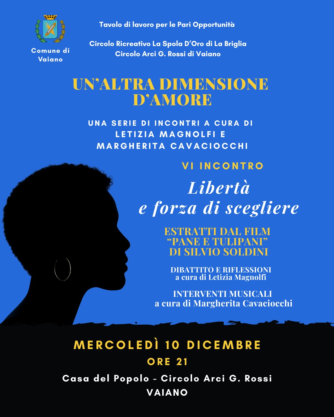 Vaiano, 9 dicembre 2025 - Si conclude mercoledì 10 dicembre il percorso culturale “Un’altra dimensione d’amore”, una rassegna dedicata alle rappresentazioni femminili nel cinema, ideata e curata da Letizia Magnolfi e Margherita Cavaciocchi e promossa dal Comune di Vaiano – Tavolo di lavoro per le Pari Opportunità, dal Circolo Ricreativo La Spola d’Oro di La Briglia e dal Circolo Arci G. Rossi di Vaiano.