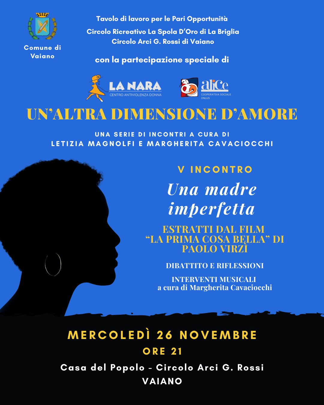 Il quinto incontro, dal titolo “Una madre imperfetta”, si terrà mercoledì 26 novembre alle ore 21 alla casa del Popolo – Circolo Arci G. Rossi di Vaiano. La serata proporrà estratti dal film “La prima cosa bella” di Paolo Virzì, accompagnati da riflessioni, dibattito e interventi musicali di Margherita Cavaciocchi.