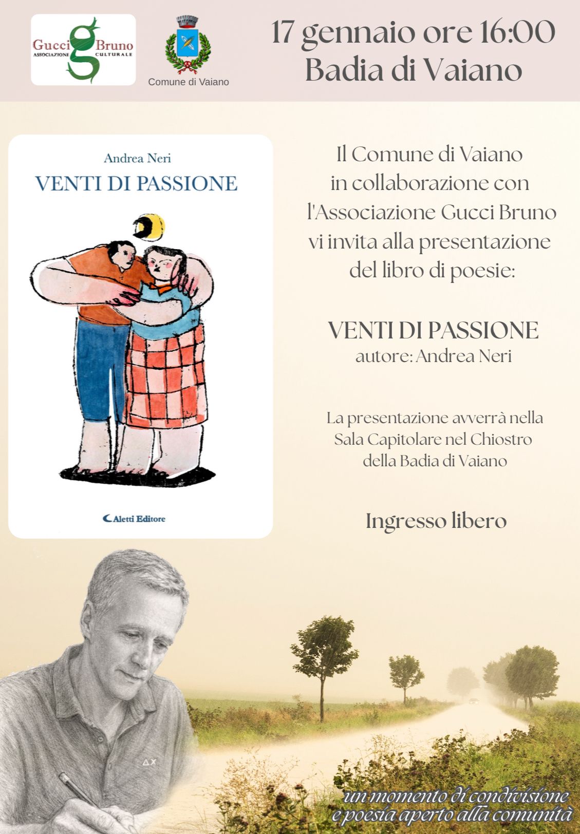Vaiano, 15 gennaio 2026 – Sabato 17 gennaio alle ore 16, nella Badia di Vaiano, l’amministrazione comunale, in collaborazione con l’Associazione culturale Bruno Gucci, presenta il volume di poesie Venti di Passione di Andrea Neri.